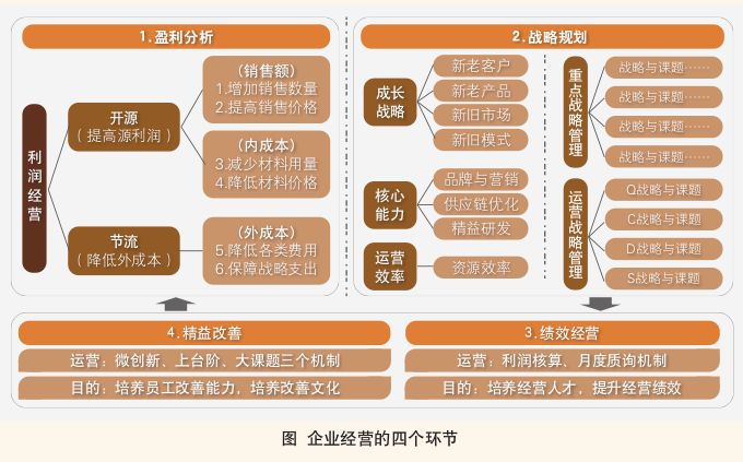 從邏輯思考和實(shí)現(xiàn)方式的角度,企業(yè)獲取利潤(rùn)的流程都是一個(gè)閉環(huán),具體包括盈利分析、戰(zhàn)略規(guī)劃、績(jī)效經(jīng)營(yíng)和精益改善等四個(gè)關(guān)鍵環(huán)節(jié)。