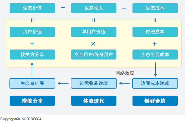 1993年,美國經(jīng)濟(jì)學(xué)家詹姆斯·穆爾提出了商業(yè)生態(tài)系統(tǒng)概念,認(rèn)為生態(tài)有三個特征:輕;不可模仿;放大性。所謂“輕”,就像亞馬孫熱帶雨林,不需要種樹,植物自會生長。所謂“不可模仿”,可以模仿創(chuàng)建一個花園,但不可能模仿創(chuàng)建一個生態(tài)。所謂“放大性”,生態(tài)生生不息,可以產(chǎn)生新物種,而花園不可能產(chǎn)生新物種。