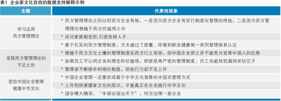 茅忠群的文化自信包括三個邏輯要素:學(xué)習(xí)并運用西方管理理論、發(fā)現(xiàn)西方管理理論的不足、學(xué)習(xí)中華文化并堅信中國企業(yè)管理更需要根植于中華文化之中,如表1所示。