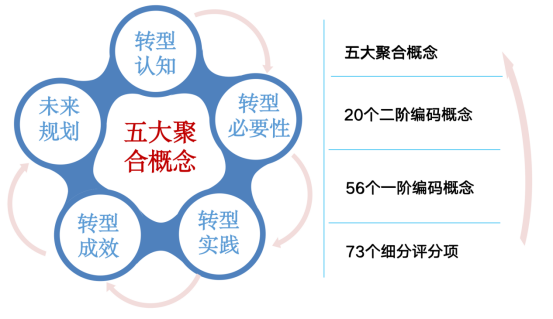我們通過(guò)編碼得到關(guān)于央企數(shù)字化轉(zhuǎn)型抽象程度最高的五個(gè)聚合概念,分別是:轉(zhuǎn)型認(rèn)知、轉(zhuǎn)型必要性理、轉(zhuǎn)型實(shí)踐、轉(zhuǎn)型成效、未來(lái)規(guī)劃。這五個(gè)聚合概念反映出央企轉(zhuǎn)型的五個(gè)重要層面,是數(shù)字化轉(zhuǎn)型的關(guān)鍵。
