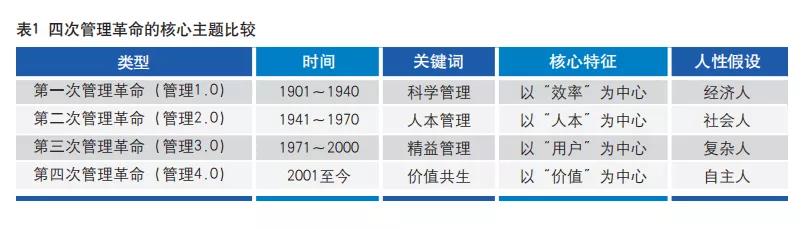 從“效率第一”到“價(jià)值第一”,管理學(xué)走過(guò)了一百多年的歷史,不斷推動(dòng)從“經(jīng)濟(jì)人”到“自主人”的跨越。見表1。