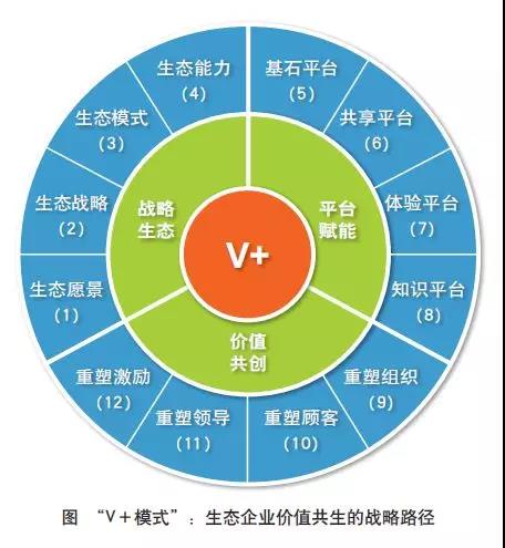 “V+模式”包括“一個(gè)中心、三個(gè)維度”,其中一個(gè)中心是指“以價(jià)值共生為中心”,三個(gè)維度是指戰(zhàn)略生態(tài)、平臺(tái)賦能和價(jià)值共創(chuàng),每個(gè)維度聚焦于價(jià)值共生中的一個(gè)核心問(wèn)題。其中,“戰(zhàn)略生態(tài)”回答的問(wèn)題是:創(chuàng)造什么價(jià)值?“平臺(tái)賦能”回答的問(wèn)題是:能不能創(chuàng)造價(jià)值?價(jià)值共創(chuàng)回答的問(wèn)題是:如何創(chuàng)造價(jià)值?