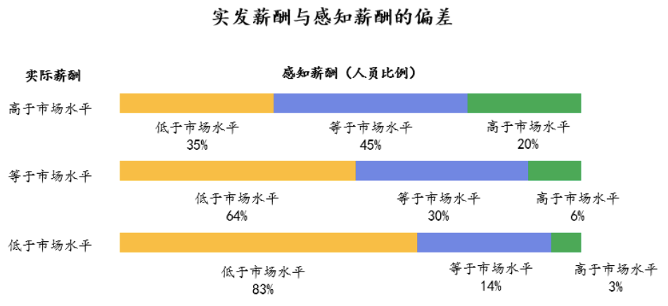 從上圖的調(diào)查結(jié)果看,即使企業(yè)提供了高于市場(chǎng)平均水平的薪酬,也只有20%的員工感知到自身的薪酬水平是高于市場(chǎng)的,高達(dá)1/3的員工拿著高于市場(chǎng)水平的薪酬卻覺得自己的薪酬低于市場(chǎng)水平。