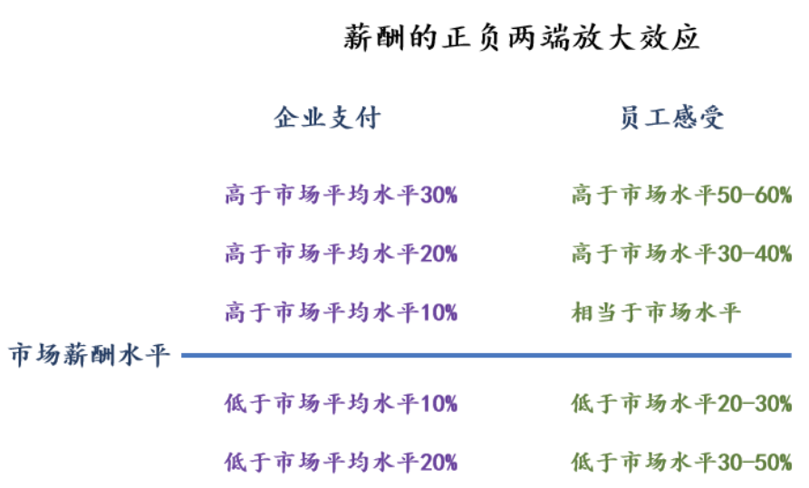 而當(dāng)企業(yè)實(shí)際支付的薪酬水平低于市場(chǎng)平均水平時(shí),員工感知的薪酬水平會(huì)有負(fù)面放大效應(yīng),即員工感知的薪酬水平會(huì)比企業(yè)實(shí)際的支付水平更低。