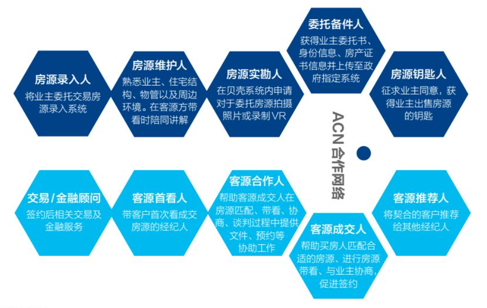 貝殼提出了ACN即經(jīng)紀(jì)人合作網(wǎng)絡(luò)模式。在這個(gè)模式下,房地產(chǎn)交易被分為:房源錄入人、房源維護(hù)人、房源實(shí)勘人、委托備件人、房源鑰匙人、客源推薦人、客源成交人、客源合作人、客源首看人、交易/金融顧問等等環(huán)節(jié)。