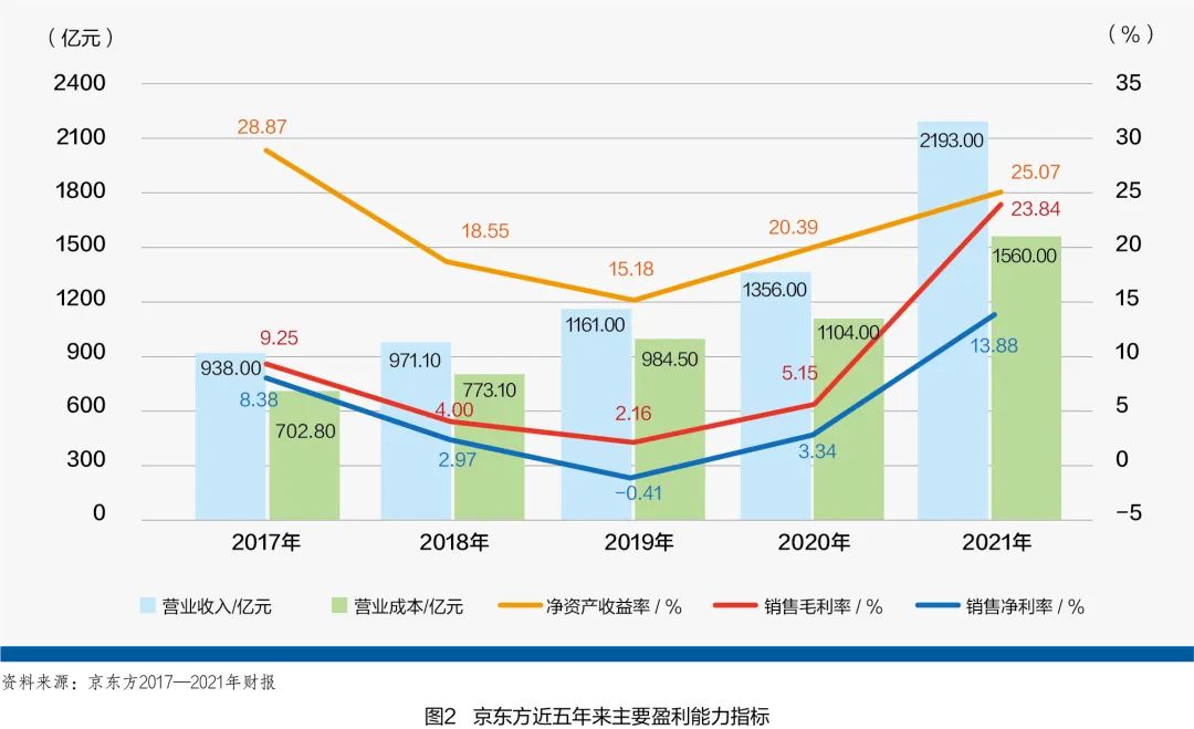 2020年以來(lái),市場(chǎng)環(huán)境不確定性因素驟增,新冠肺炎疫情下“宅經(jīng)濟(jì)”爆發(fā)性增長(zhǎng)使得顯示面板行業(yè)面臨新的機(jī)遇與挑戰(zhàn)。京東方在危機(jī)中育新機(jī),于變局中開(kāi)新局,“屏之物聯(lián)”戰(zhàn)略轉(zhuǎn)型成效初顯,物聯(lián)網(wǎng)創(chuàng)新業(yè)務(wù)快速發(fā)展,盈利能力大幅提升(如圖2所示)。