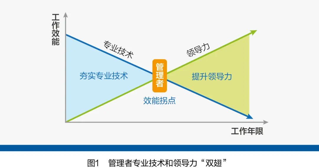 隨著工作年限增長(zhǎng)和職位提升,員工的專業(yè)技術(shù)對(duì)工作效能的貢獻(xiàn)率逐漸降低,其領(lǐng)導(dǎo)力對(duì)工作效能的貢獻(xiàn)率則不斷提升,兩條效能線的交匯點(diǎn)是員工可能成為管理者的重要節(jié)點(diǎn),如圖1所示。