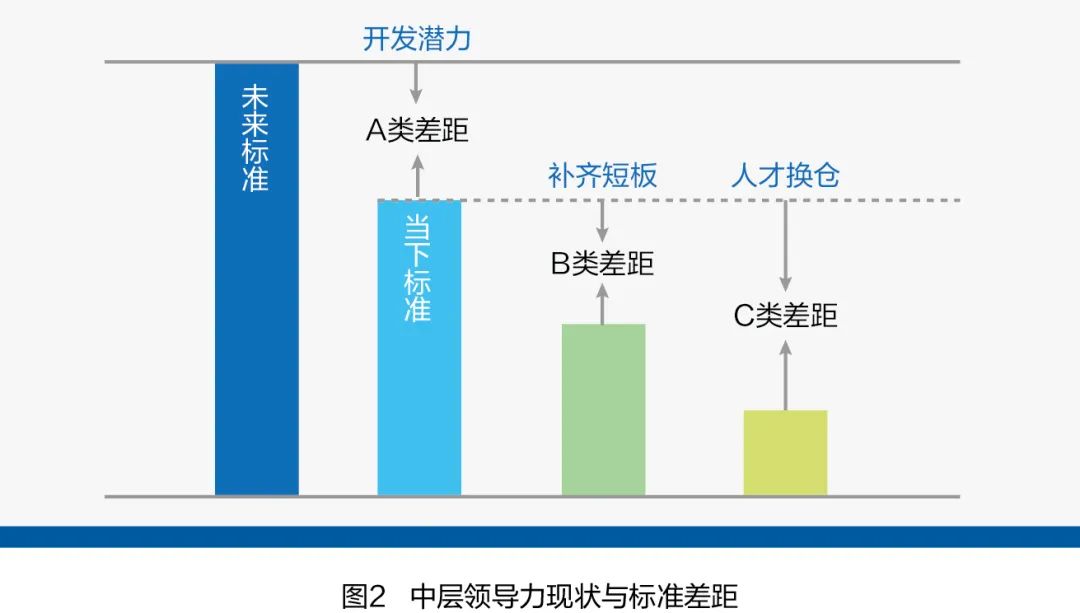 如圖2所示,根據(jù)“二八原則”,選擇20%左右績(jī)效好、潛力高的A類中層管理者納入關(guān)鍵人才后備梯隊(duì),作為當(dāng)下標(biāo)準(zhǔn)對(duì)標(biāo)未來領(lǐng)導(dǎo)力標(biāo)準(zhǔn)(領(lǐng)導(dǎo)力模型),系統(tǒng)化提升領(lǐng)導(dǎo)力;對(duì)于70%績(jī)效良好但潛力一般的B類中層管理者,對(duì)標(biāo)當(dāng)下領(lǐng)導(dǎo)力標(biāo)準(zhǔn),補(bǔ)齊短板即可;對(duì)于剩余10%績(jī)效差、潛力低的C類中層管理者,通過員工晉升或外部招聘,進(jìn)行人才換倉。