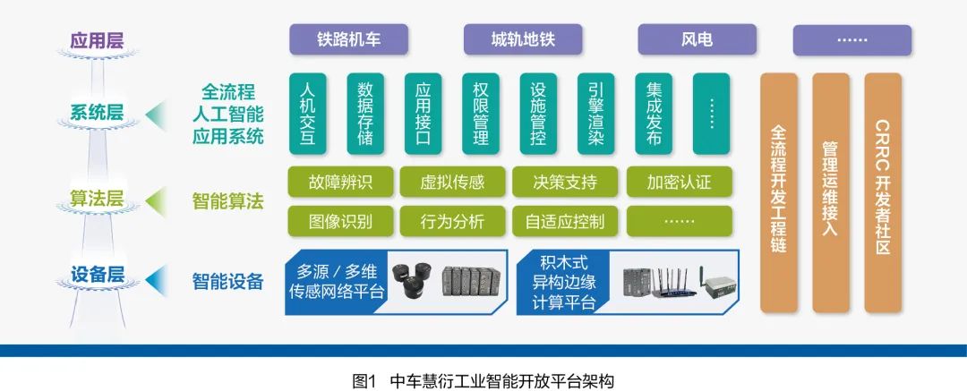 針對(duì)上述軌道交通、風(fēng)電領(lǐng)域裝備健康管理存在問(wèn)題,中車(chē)研究院歷經(jīng)7年,構(gòu)建包括設(shè)備層、算法層、系統(tǒng)層、應(yīng)用層的云、邊、端協(xié)同的中車(chē)慧衍工業(yè)智能開(kāi)放平臺(tái)(如圖1所示),幫助用戶企業(yè)提升裝備健康管理水平。