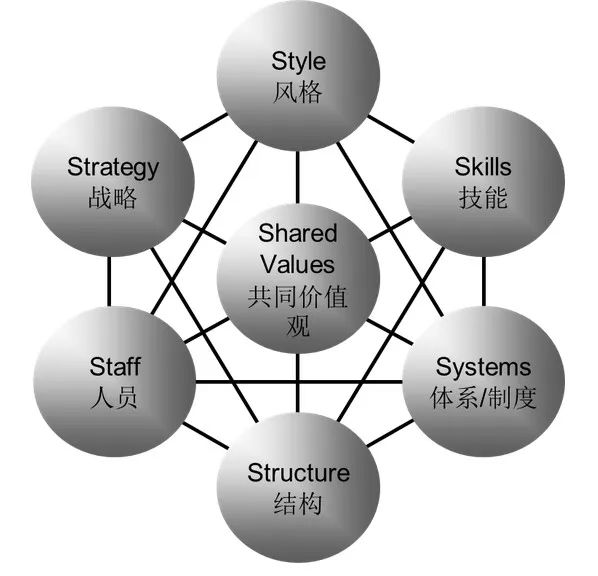 麥肯錫提出的企業(yè)組織七要素,指出了企業(yè)在發(fā)展過(guò)程中必須全面地考慮各方面的情況,包括結(jié)構(gòu)(structure)、制度(system)、風(fēng)格(style)、員工(staff)、技能(skill)、戰(zhàn)略(strategy)、共同的價(jià)值觀(guān)(shared values)。