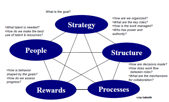 以前我在一家跨國(guó)公司工作時(shí),公司培訓(xùn)HR們使用過(guò)一個(gè)相對(duì)簡(jiǎn)單的模型,同樣可以很方便地起到診斷和評(píng)估組織能力的作用。該模型包括5個(gè)方面,和麥肯錫的7S模型比較接近。